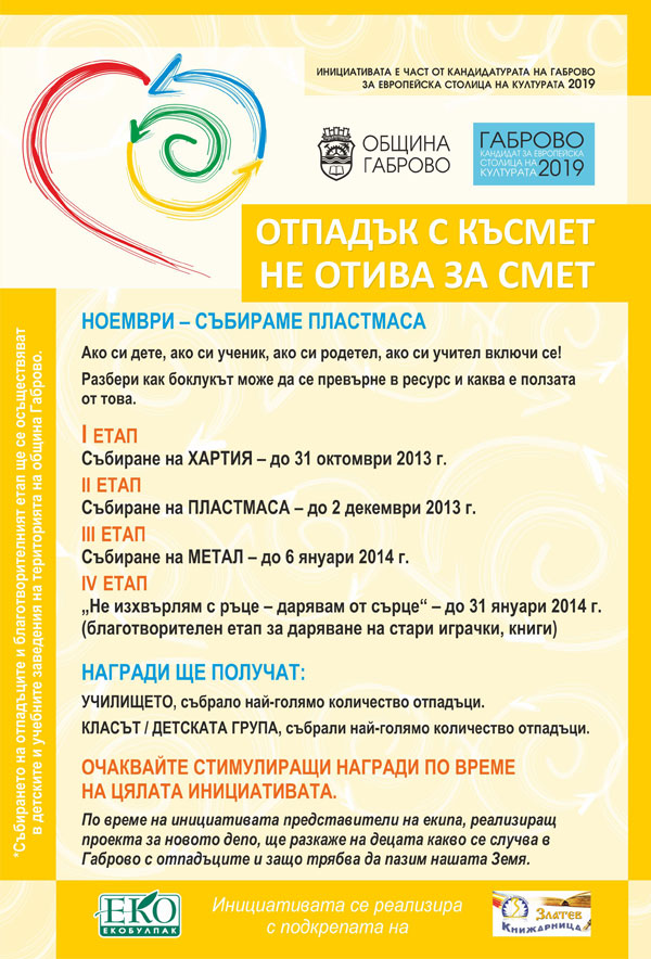 На 31 октомври, в навечерието на деня на Народните будители, ще бъде финализиран първият етап от кампанията „Отпадък с късмет – не отива за смет“. Екипът на проект „Изграждане на регионална система за управление на отпадъците в регион Габрово“ ще посети всички училища и детски градини, заявили желание за участие в инициативата, и ще отчете събраните количества хартия.