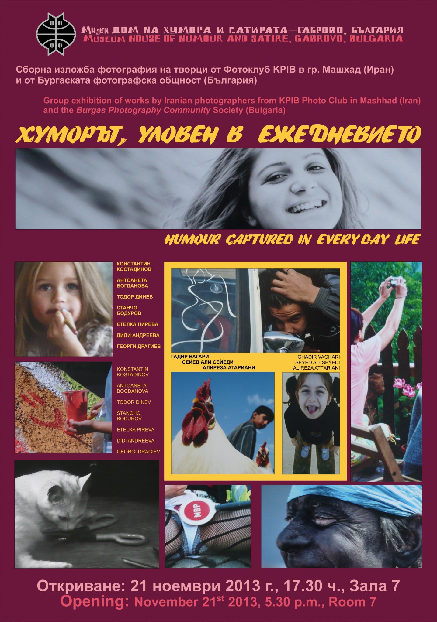 На 21 ноември тази година, от 17.30 часа в зала 7 на Музея „Дом на хумора и сатирата” ще бъде открита сборна изложба фотография на творци от Фотоклуб KPIB в гр. Машхад (Иран) и от Бургаската фотографска общност (България). Домът предлага за втори път съвместна фотоизложба – своеобразен диалог между ирански и български автори след успешната им подобна изява през 2010 г.