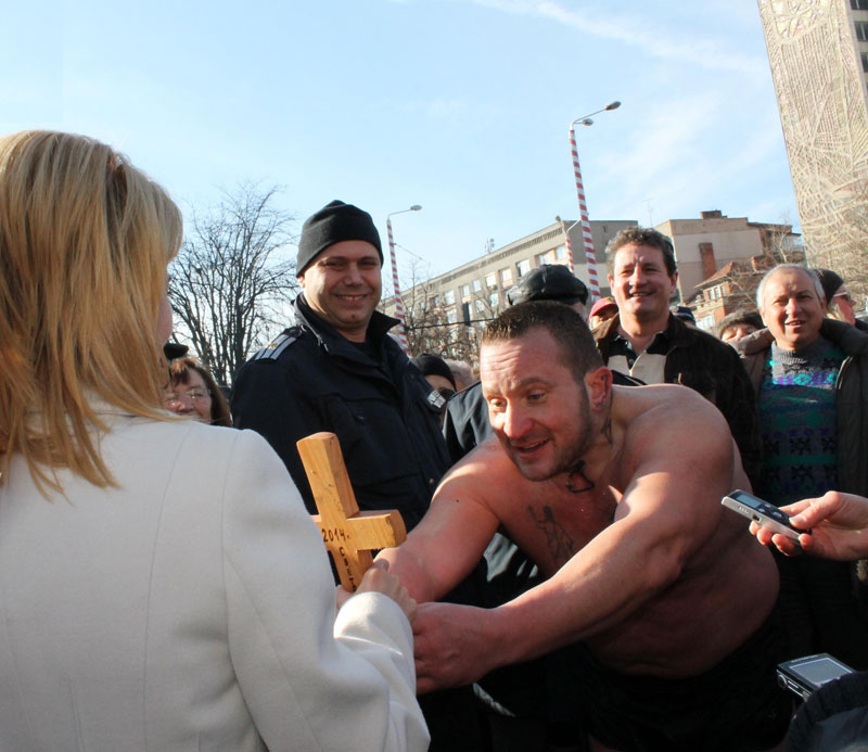 Преди две години Божидар за пръв път успя да извади кръста на Йордановден. Днес във водите на Янтра се хвърлиха и други смелчаци, но именникът отново пребори конкурентите си. 40-годишният мъж, бръснар по професия, е женен с две деца.