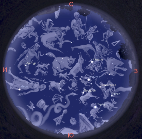 След залеза на Слънцето, на вечерното небе от запад близо до хоризонта все още се виждат зимните съзвездия – Бик, Орион и Близнаци. Голямата мечка се намира на североизток, а на юг и югоизток се открояват пролетните съзвездия – Лъв, Дева и Везни.