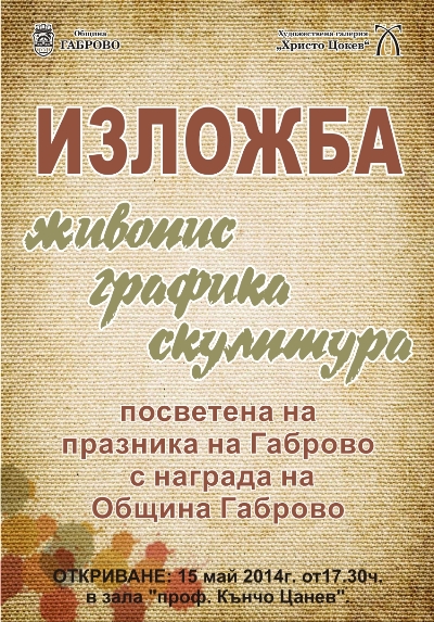 Художествена галерия „Христо Цокев” има удоволствието да Ви покани на традиционната си майска изложба Посветена на празника на града с наградата на Община Габрово. Откриването ще се състои на 15 май /четвъртък/ от 17.30 ч. в зала „проф. Кънчо Цанев”.
