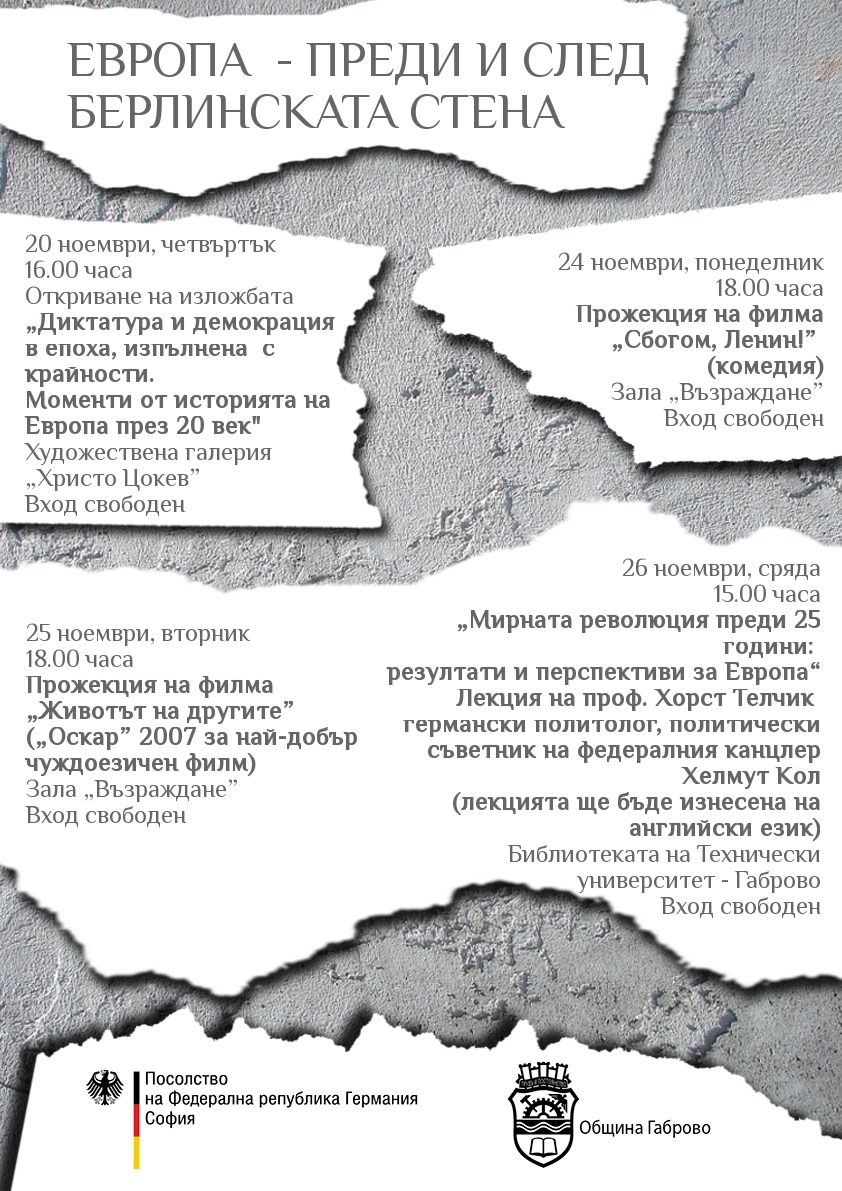 Инициативата „Европа преди и след падането на Берлинската стена” включва още: 2 филмови прожекции в зала „Възраждане” на 24 и 25 ноември от 18.00 ч. и лекция на проф. Хорст Телчик - пряк участник в събитията в Германия от 1989 година, която ще се проведе на 26 ноември от 15.00 ч. в конферентната зала на Библиотеката на Технически университет – Габрово.