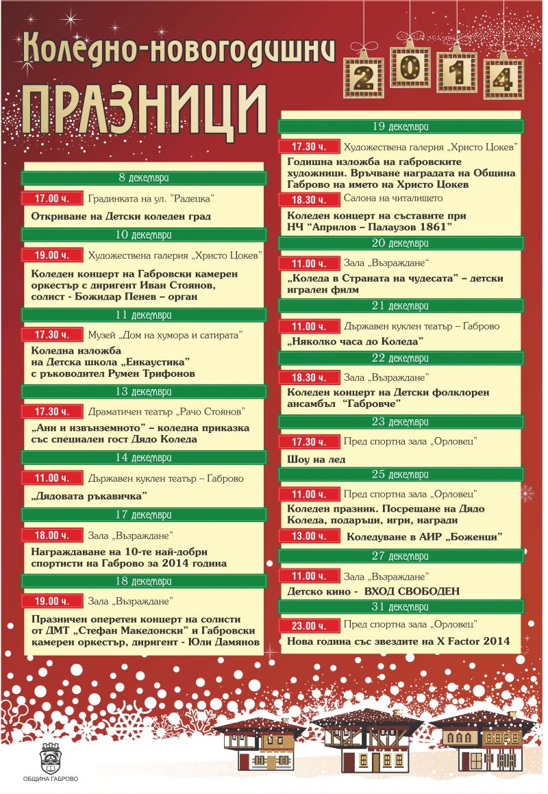 Старата година ще изпратим в компанията на звездите на X Factor 2014. Часът на срещата е 23.00, пред Спортна зала „Орловец”. За празничното настроение след полунощ ще се погрижат музикантите от оркестър „Габрово”. Новата 2015 година ще посрещнем по традиция с български хора, празнични илюминации и много настроение.