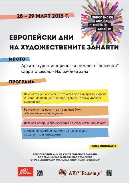 РСО „Централна Стара планина” и АИР „Боженци” организират на 28 и 29 март 2015 г. първите Европейски дни на художествените занаяти в България.