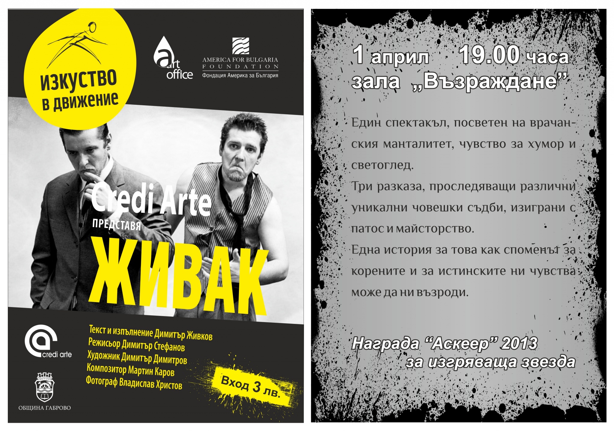 На 1 април, точно в 19.00 часа младата звезда на театралния небосклон - Димитър Живков, ще блесне на сцената на зала „Възраждане”. Авторският му моноспектакъл „Живак” първо здраво ще ви разсмее, после малко ще ви натъжи, а накрая ще ви изпрати с преизпълнени сетива!