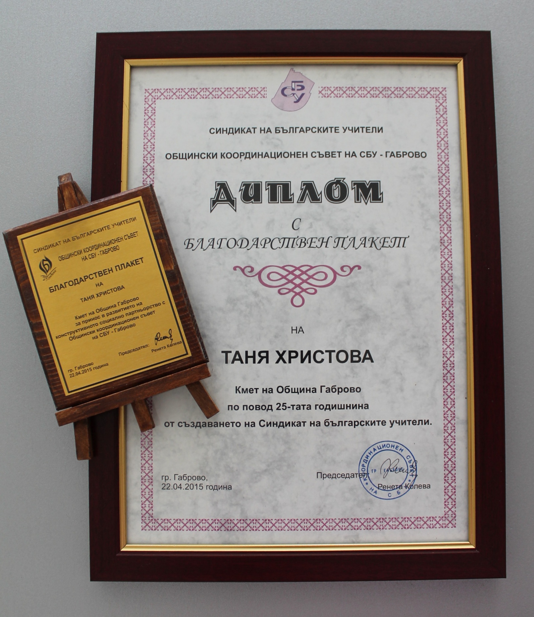 Кметът на Габрово – г-жа Таня Христова беше отличена с диплом с благодарствен плакет по повод двадесет и петата годишнина от създаването на Синдикат на българските учители.  „За принос в развитието на конструктивното социално партньорство с Общински координационен съвет на СБУ – Габрово“ е отбелязано на плакета, който беше получен от г-жа Нела Рачевиц, заместник кмет - "Социално‐икономическо развитие".