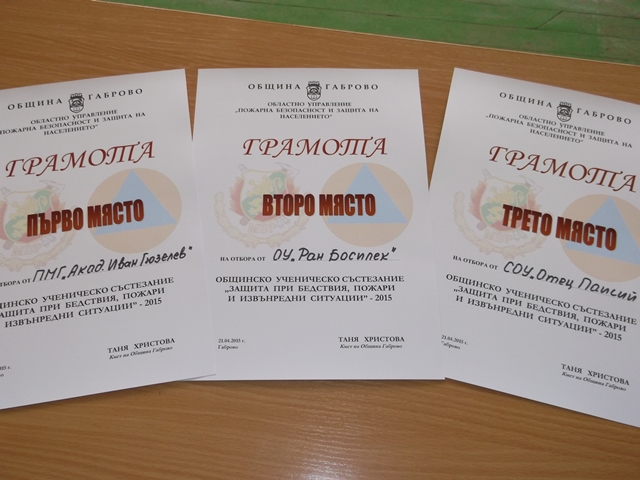 Общинският кръг на ученическото състезание „Защита при бедствия, пожари и извънредни ситуации“ се проведе на 21 април тази година в ОУ „Иван Вазов“. Организатор на проявата бе Регионална дирекция "Пожарна безопасност и защита на населението" – Габрово в партньорство с Община Габрово, Министерство на образованието и науката и Националния дворец на децата.