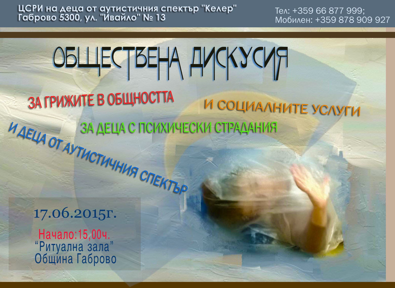 На 17.06.2015 г. от 15.00ч. в Ритуалната зала на Община Габрово, Център за социална рехабилитация и интеграция за деца от аутистичния спектър “Келер” организира първа работна среща на тема „Обществена дискусия за грижите в общността и социалните услуги за деца с психически страдания и деца от аутистичния спектър”. Гости на срещата ще бъдат: