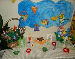 Пъстри Великденски базари посрещат още от входа родителите и гостите на двете бази на целодневна детска градина „Слънце”. Изключително веселите и красиви кошнички, боядисани и украсени с различни технологии яйца и поставки за тях, са изработени от децата, с помощта на техните родители. „Бяхме искрено изненадани от желанието, с което се включиха всички”, споделиха учителките на детското заведение. Сред експонатите в изложбата могат да бъдат видяни истински уникати – яйца със залепени по тях картини от цветна хартия, изобразяващи четирите сезона на годината, както и такива, украсени с разноцветни семена. Ценителите могат да открият и цветя от хартия, и пъстри картички.