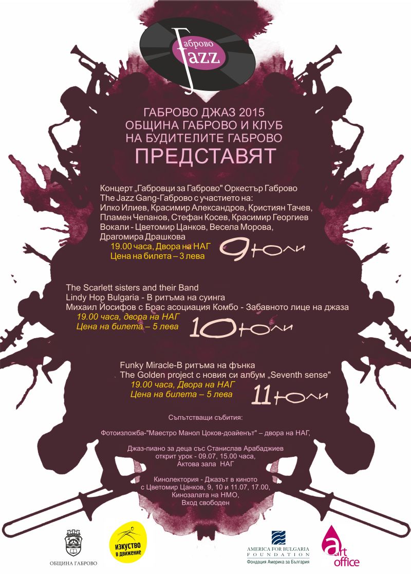 От трети юли, петък, на улица "Радецка", до безистена, започва продажбата на билети за джаз фестивала „Габрово джаз”. Три поредни вечери – на 9, 10 и 11 юли в двора на Националната Априловска гимназия ще звучи любимата на милиони души по света джаз музика. Габровци и гости на града ще слушат Оркестър Габрово, сборна формация от талантливи габровски музиканти, избрала за себе си името The Jazz Gang, Scarllett Sisters, Funky miracle, Golden project и Брас Dсоциация Комбо. Началният час на концертите е 19.00, а цената на билетите - 3.00 /за първата вечер/ и 5.00 лева /за останалите две/. При лошо време концертите ще се проведат в зала „Възраждане”.