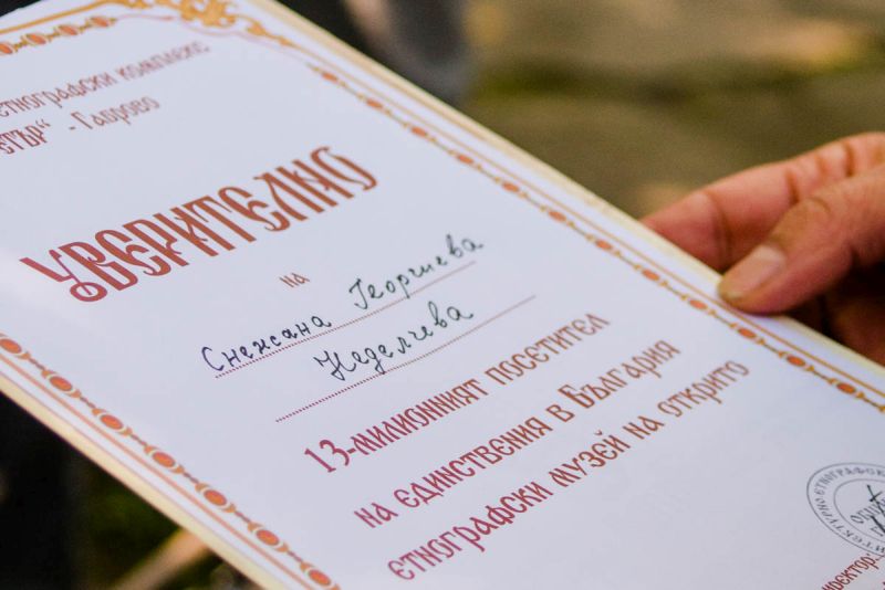 Снежана сподели, че от 20 години не е посещавала музея и е приятно изненадана, че точно тя е 13-милионният посетител. Екипът на музея беше подготвил подаръци и изненади - триптих с пейзажи от "Етър"-а, ръчно изработени изделия от занаятчиите: Андрей Андреев - майстор ножар, Веселин Дамянов - майстор грънчар, Цветомир Минчев - майстор дърворезбар, Павлин Колев - майстор шекерджия, Татяна Петкова - майстор фурнаджия, Даниела Тухладжиева - майстор тъкач. Снежана написа послание в книгата за почетните гости: "Завърнат спомен след 20 години. Добри спомени и усещане."