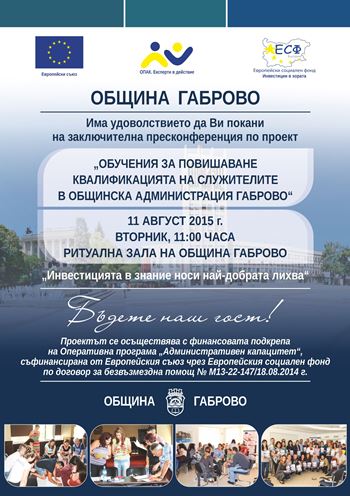 Заключителна пресконференция по повод приключване на проект „Обучения за повишаване квалификацията на служителите в общинска администрация Габрово“ ще се състои днес, 11 август 2015 г., от 11:00 часа в Ритуална зала на Общината.