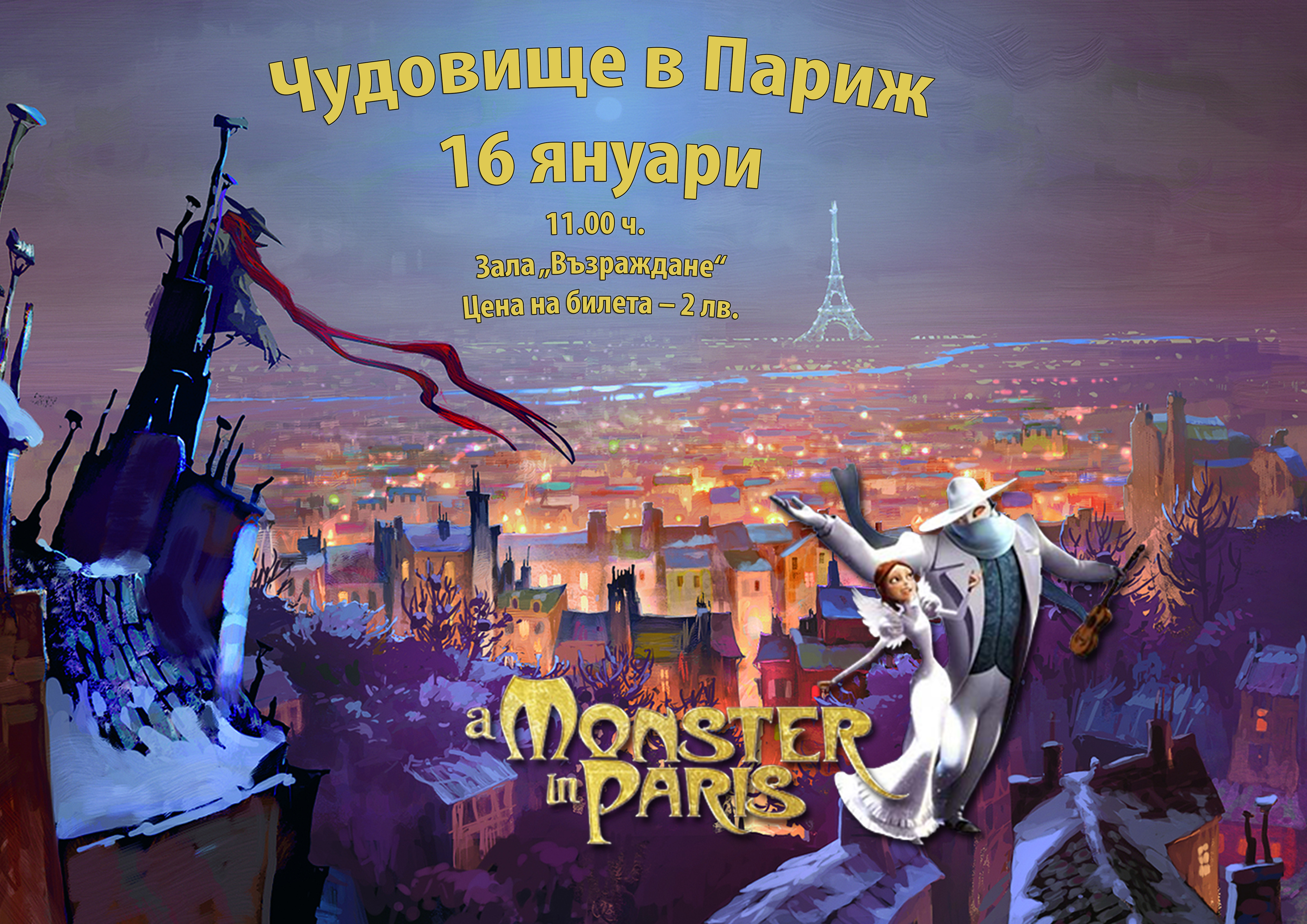 На 16 януари, събота, от 11.00 ч. ще започне прожекцията на френския анимационнен филм „Чудовище в Париж“.