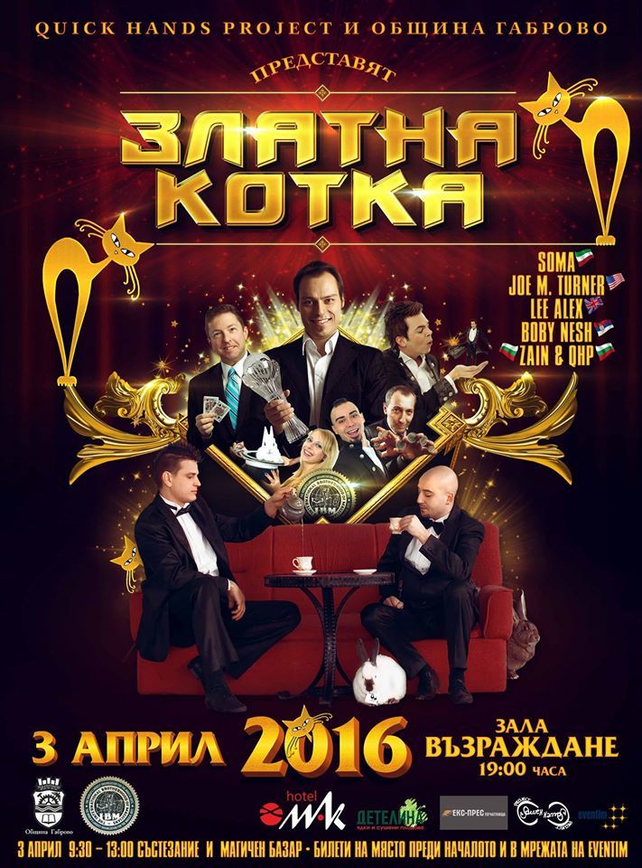 „В артистичните среди името на Габрово се споменава все по-често като пример за някой, който прави много за изкуството“ – споделиха още Йордан Белев и Мистър Джим от Quick Hands Project и разказаха как тяхната идея се развива от благотворителен концерт до най-голямото магично шоу на Балканите и Източна Европа, а именно „Златна котка 2016 IBM edition“. „IBM“ или „Международното братство на магьосниците“ е най-голямата организация на маговете в световен мащаб, а фактът че миналогодишният й председател беше, а тазгодишният предстои да бъде сред професионалистите, които ще видим като жури, а също така и на сцената в галаспектакъла, говори достатъчно за сериозността на събитието.