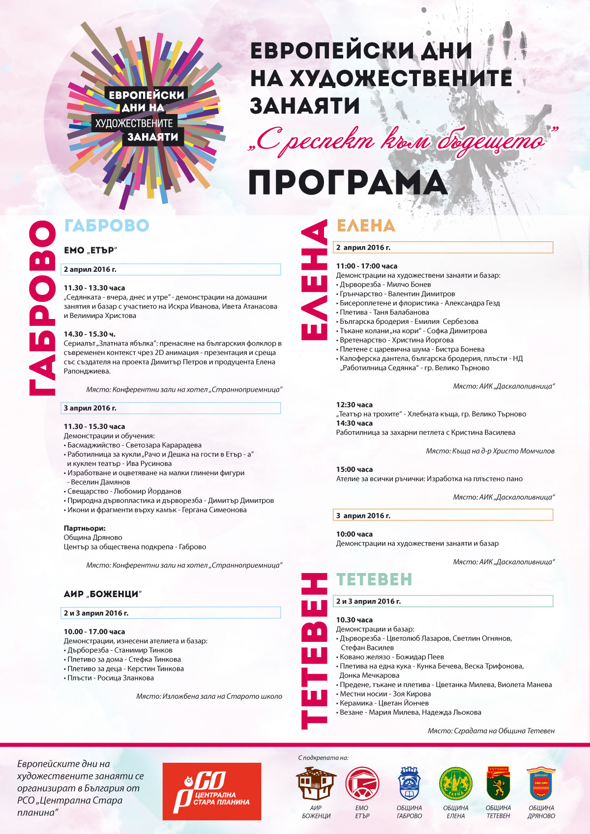 За втора поредна година община Габрово се включва в инициатива Европейски дни на художествените занаяти. Координатор на дните в нашата страна е Регионално сдружение на общини „Централна Стара планина“, като тази година неговите усилия са подкрепени и от общините Дряново, Елена и Тетевен.