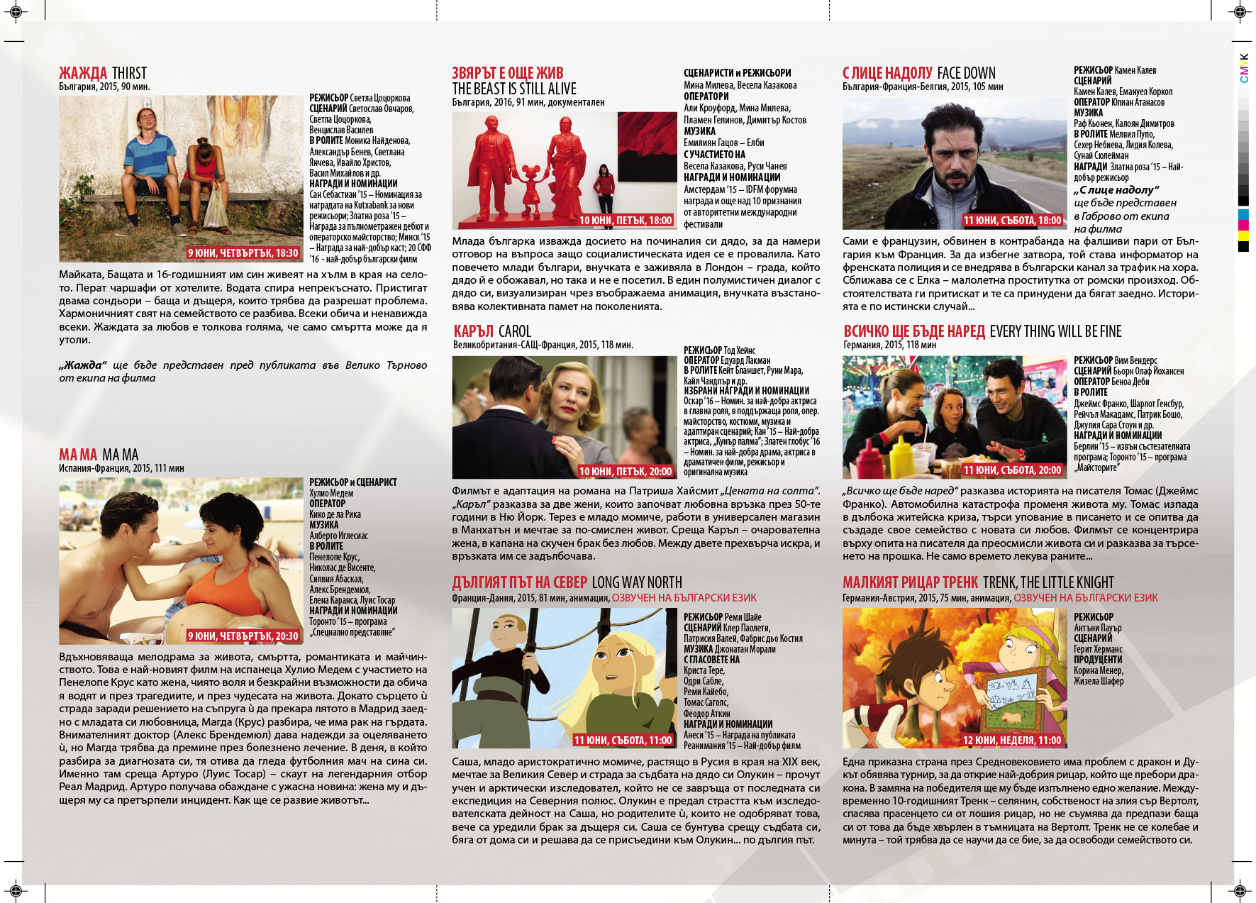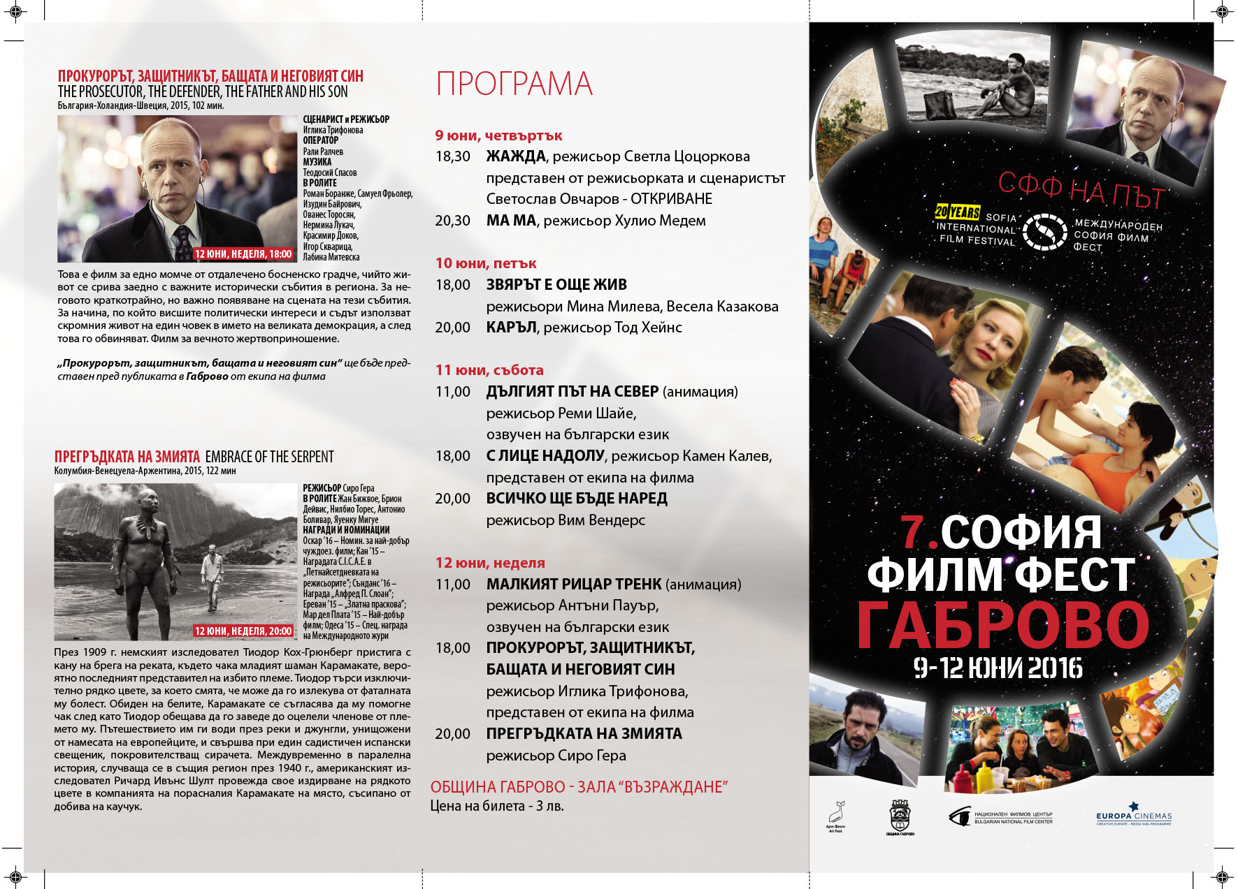 Залата „ВЪЗРАЖДАНЕ” в центъра на Габрово по традиция ще се превърне в дом за киноманите в града от 9 до 12 юни. Четирите дни са наситени с българско киноприсъствие, а на екрана ще видим заглавия като „ЖАЖДА” на Светла Цоцоркова, „Звярът е още жив” на авторското дуо Мина Милева и Весела Казакова, „С ЛИЦЕ НАДОЛУ” на Камен Калев, „Прокурорът, защитникът, бащата и неговият син” , който събира на снимачната площадка Ромен Боранже, Самуел Фрьолер, световноизвестната македонска актриса Лабина Митевска, Нермина Лукач, Изудин Байрович и българските актьори Ованес Торосян и Красимир Доков. Оператор е Рали Ралчев, композитор - Теодосий Спасов, продуцент - Росица Вълканова.