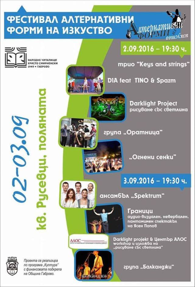 Емоциите ще продължат във вечерните часове на 2 и 3 септември с Етно-джаз фестивал по проект „Алтернативни форми на изкуство” на НЧ „Христо Смирненски 1949”, съфинансиран по Програма Култура на Община Габрово. На поляната в квартал Русевци ще се изявят креативните млади артисти от трио "Keys and strings", DIA и TINO&Spazm, група "Оратница", ансамбъл "Spektrum", Ясен Попов, а пространството ще бъде изрисувано със светлина от Darklight project и „Огнени сенки“.