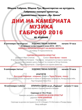 40-то издание на Международния фестивал „Дни на камерната музика“ Габрово 2016 ще запази стремежа да обновява афиша си с нетрадиционни концерти и да разчупва рутината и стереотипите при програмирането. За пръв път от много години джазът ще присъства само с елитни музиканти, които обаче ще влязат в ролята на изпълнители на класическа музика.