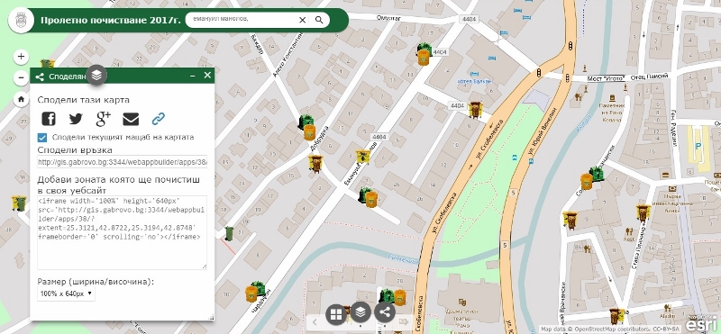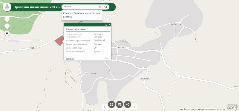 Специално за кампанията Община Габрово създаде ГИС приложение, посветено на пролетното почистване 2017 г. В него са отбелязани точното местоположение на зоните за почистване, лицата или организациите, заявили интерес и броя на участниците в почистването на всяко място.