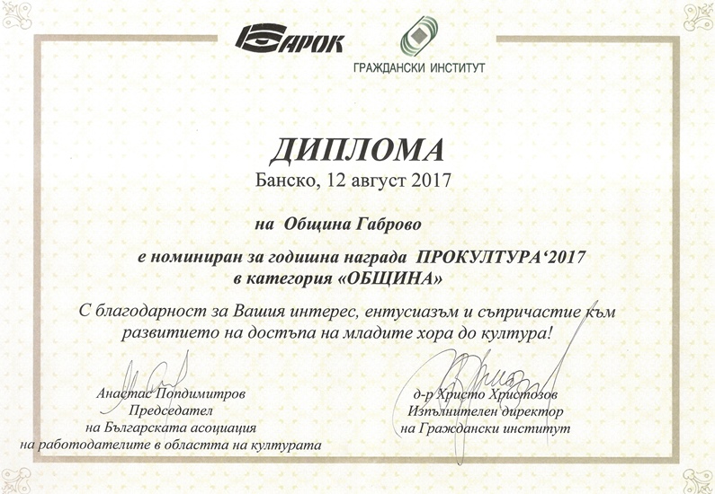 Дипломата за отличие бе връчена на Община Габрово по време на V национална конференция „Достъп на младите хора до култура: Дигиталните иновации“, която се състоя в края на миналата седмица в град Банско.