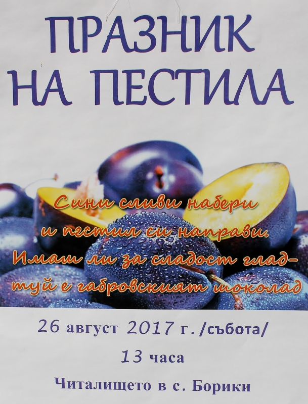 НЧ „Пейо Яворов-1927“ и РЕКИЦ Читалища Ви канят на станалия вече традиционен празник на пестила в село Борики. На 26 август от 13 часа в читалището може да видите и сами да участвате в демонстрации на традиционни рецепти, чиято основна съставка са сините сливи.