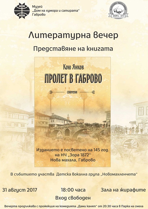 В последния ден от месеца – 31 август – от 20:30 часа Лятното кино в Парка на смеха ще ни предложи забавна вечер с българския игрален филм „Дами канят“. Режисьор на филма е Иван Андонов, а сценарист – Георги Мишев. Филмът е заснет през 1980 година. В главните роли ще видим любими български актьори: Стефан Данаилов, Невена Коканова, Цветана Манева, Илка Зафирова, Мария Статулова, Надя Тодорова, Йорданка Кузманова и др. Чаровен инструктор по шофиране след развода си се отдава на лекомислени авантюри. И въпреки че всяка от жените, които го ухажват, се опитва здраво да го впримчи, неотразимият Дон Жуан успява да излезе от всякакви капани. Младият почитател на любовните афери има инцидентни проблеми с ревниви съпрузи, но много по-сериозни са проблемите му с преследващите го влюбени жени. Преди филмите, от 18:00 ч. Ви каним на Литературни вечери в Дома. На 31.08. НЧ „Зора - 1892“ кв. Новата Махала представя книгата „Пролет в Габрово“ на писателя Кою Янков, а на 01.09.2017г. Йото Пацов ще представи книгата „Ангелът и Яков“ на габровския писател Георги Ганев.