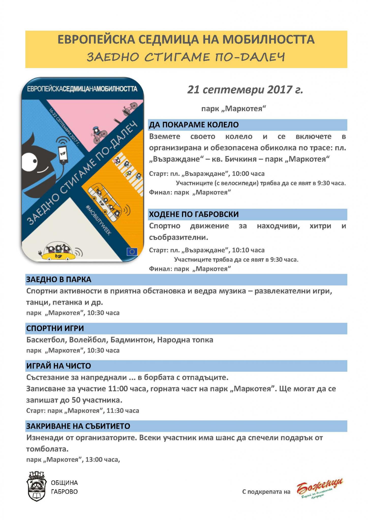 Седмицата на мобилността в Габрово ще бъде отбелязана на 21 септември 2017г., като в 10:00 часа от площад „Възраждане“ ще стартира велосипедна разходка, наречена „Да покараме колело“, а от 10:10 часа е стартът на нетрадиционната спортна активност „Ходене по габровски“. Желаещите да се включат и в двете инициативи трябва да се явят в 9:30 часа, като участниците във велосипедната разходка е нужно да бъдат придружени от своето колело, с което ще преминат по трасе: пл. „Възраждане“-кв. Бичкиня-парк „Маркотея“. Пешеходното (пъте)шествие ще започне от пл. „Възраждане“ ще премине булевардите „Априлов“ и „Трети март“ и ще финишира в парк „Маркотея“. Участниците във велосипедната обиколка ще се движат в група с ескорт, а трасето за пешеходното шествие ще бъде затворено за моторни превозни средства за времето от 09:15 до около 10:30 часа.