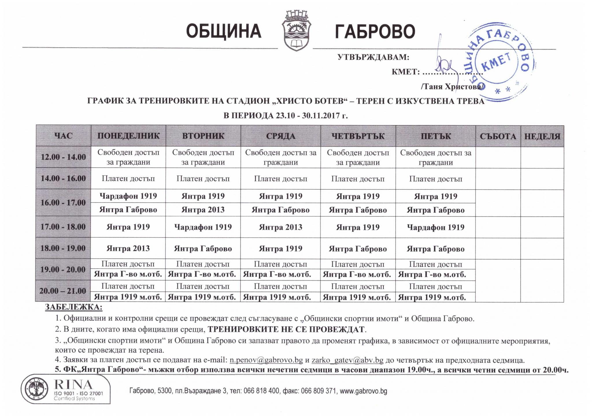 Във връзка с множеството сигнали и запитвания, постъпили в Община Габрово относно достъпа до терена с изкуствена трева в Спортен комплекс „Христо Ботев“ от страна на гражданите и футболните клубове, регистрирани на територията на общината, публикуваме, утвърдения за целта тренировъчен график за периода 23 октомври – 30 ноември 2017 г.