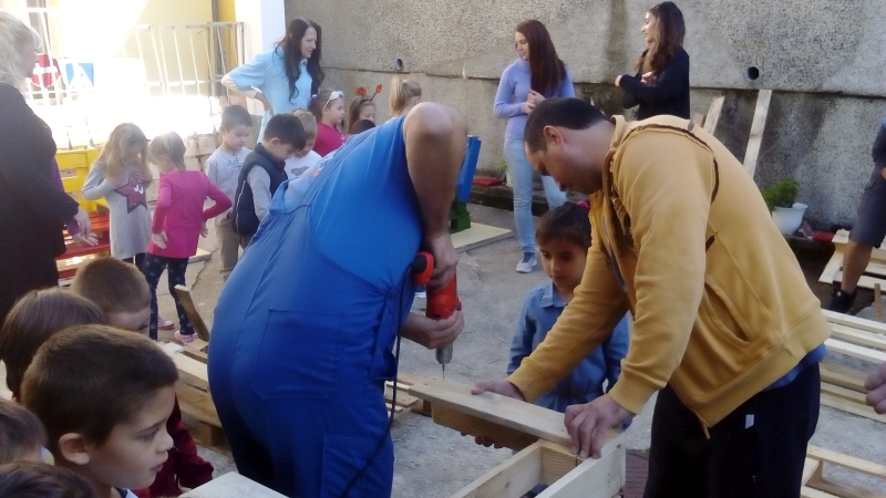 Млади софтуерни специалисти организираха доброволческа инициатива в габровската ДГ „Дъга“. Заедно с децата изработиха от палети дивани и масички за приложна дейност, боядисаха с цветовете на дъгата входа и оградата на детската градина.
