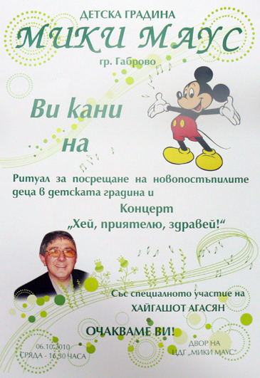 С концерт със специалното участие на Хайгашот Агасян ще посрещне новопостъпилите деца целодневна детска градина „Мики Маус” в Габрово. Той ще се състои на 6 октомври 2010 г. от 16.30 часа в двора на градината. По този начин детското заведение ще отпразнува и 35-годишнината от откриването си.
