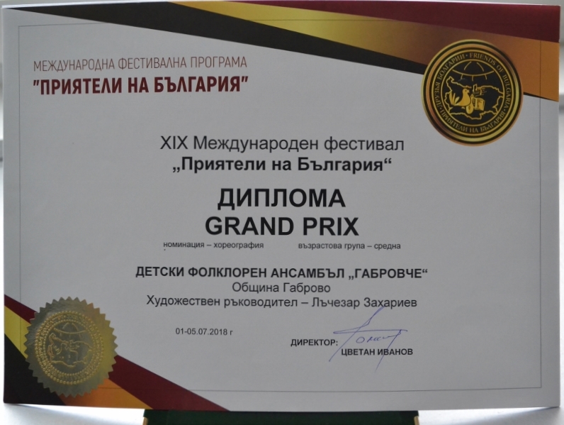 Децата от ДФА „Габровче“ завоюваха поредната голяма награда от международен форум в конкуренция с много чуждестранни участници. Младите танцьори и певци се върнаха с „Гран При“ от ХІХ Международен фестивал „Приятели на България“, който се проведе от 1 до 5 юли 2018 г. в курортен комплекс Албена.