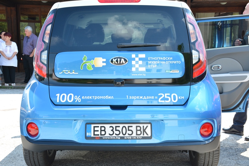От днес администрацията на Етнографския музей на открито „Етър“ ще ползва електрически автомобил. Лъскавото возило – марка КИА Соул EV, пристигна на площада пред хотела към музея. В присъствието на габровския кмет Таня Христова директорът Светла Димитрова получи ключовете от инж. Добромир Димов – управител на отдел „Продажби“ във фирма „Веко Ойл“ ЕООД, официален представител на „Киа Моторс България“ за региона.