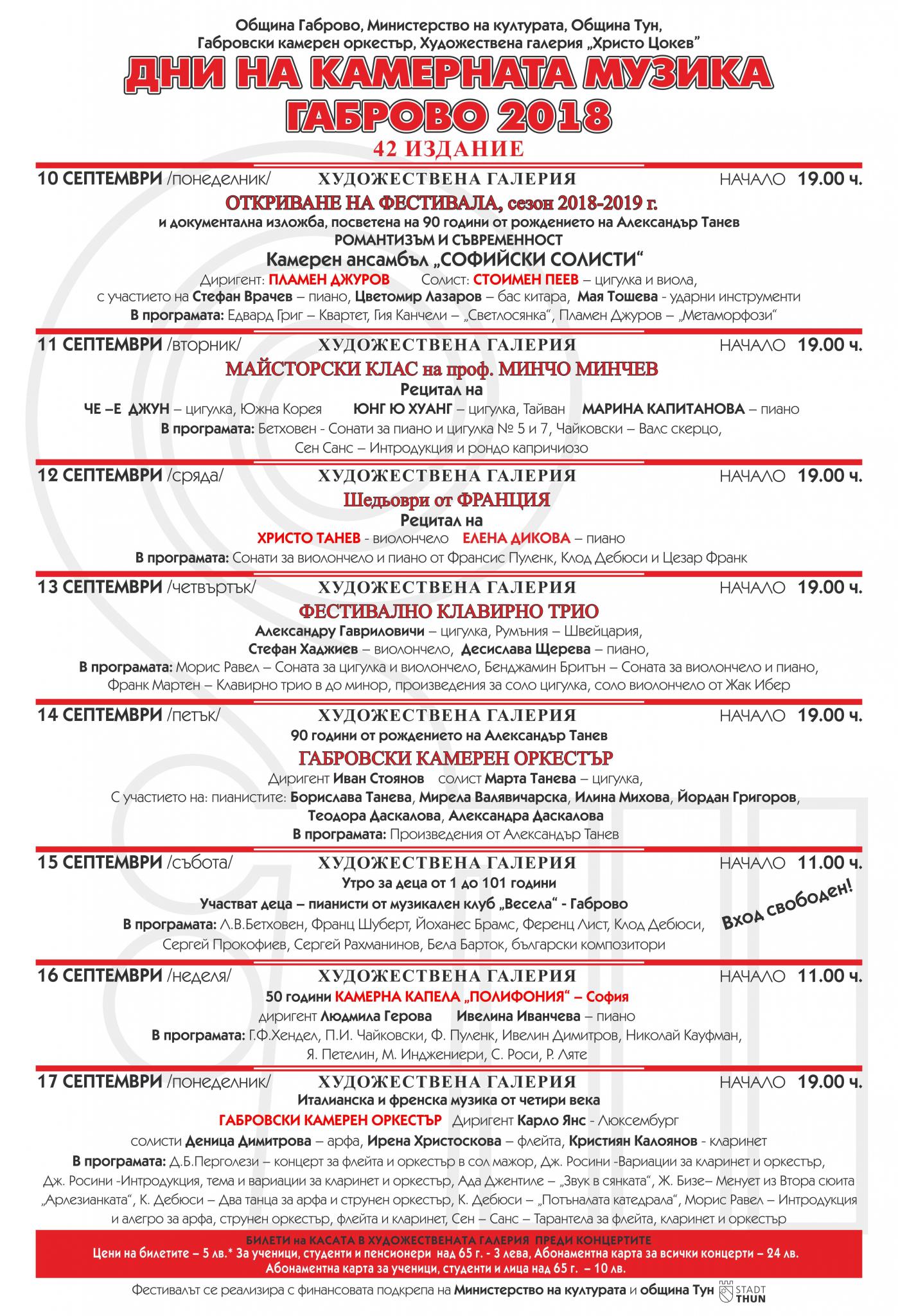Едно от най-значимите музикални събития в нашия град - "Дни на камерната музика", ще се проведе от 10 до 17 септември в Художествена галерия "Христо Цокев". Концертите са с начален час 19 часа. Предлагаме на вашето внимание програмата на събитието.