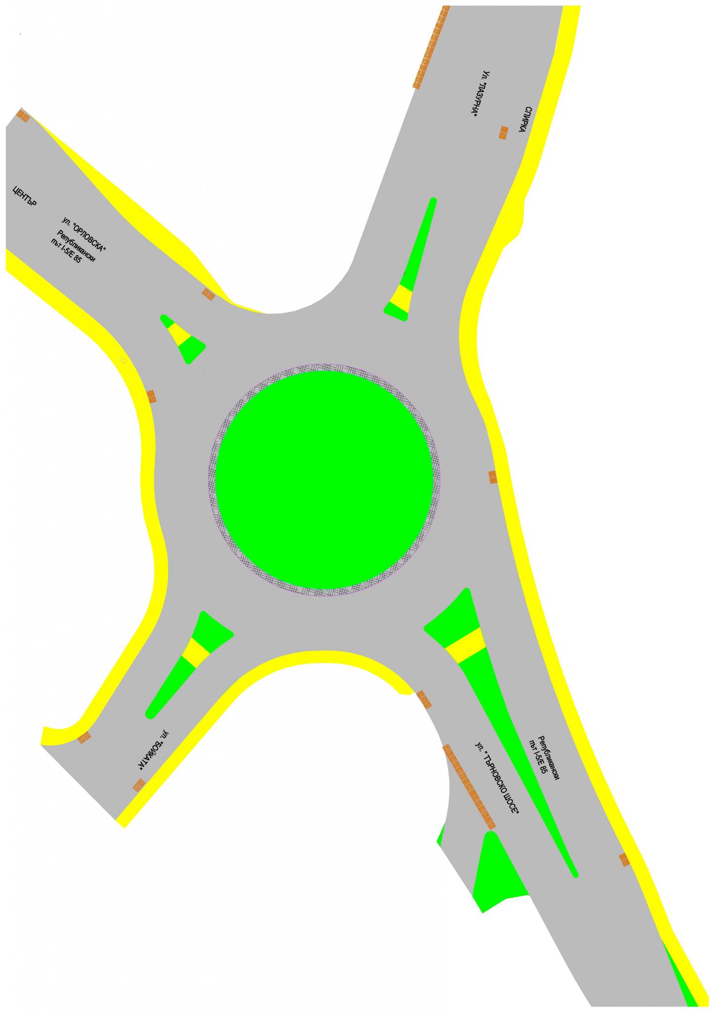 С настоящия проект се предлага кръгово движение с радиус на централния остров 16,00 м и ширина на двулентово пътно платно общо 8,00 м. С оглед на по-доброто визуално възприемане и насочване на движението в правилна посока от движещите се към него превозни средства, централният остров ще бъде повдигнат спрямо пътното платно.