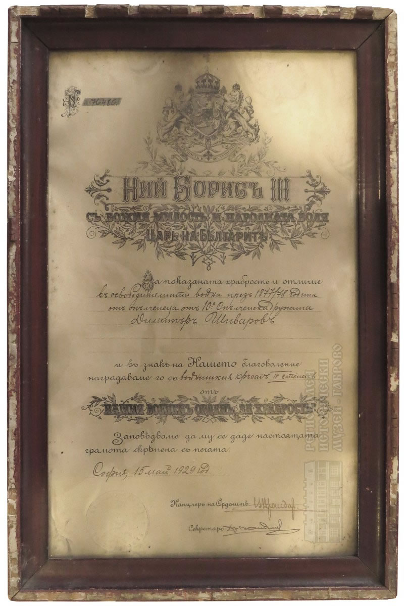„Културна ценност на месец март на Регионален исторически музей – Габрово е Грамота № 76 480 на опълченеца Димитър Шиваров от 15 май 1929 г., която „заповядваме да му се даде“ в София. Той я получава от „Борисъ III с божия милост и народна воля Царь на българите“. Удостоверява неговото награждаване с войнишки кръст II-ра степен „за показаната храброст и отличие в Освободителната война през 1877/ 1878 г.“. Документът е подпечатан и подписан от канцлера на ордените и секретаря. Поставена е в дървена рамка, липсва декоративен кант.”