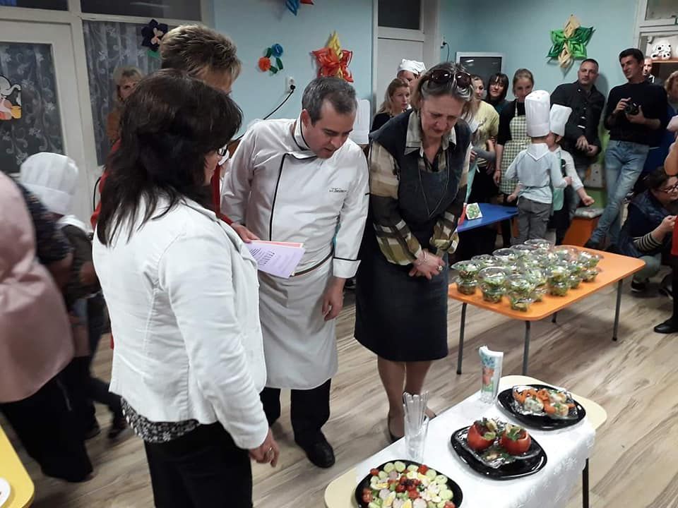 Заедно със своите учители и родителите, малките готвачи запретнаха ръкави и се заеха с приготвянето на тристепенно меню, състоящо се от зелена салата, пилешко филе с гарнитура и пълнени ябълки с плодове, мед и орехи. Всеки отделен отбор в рамките на 20 мин. трябваше да приготви съответно ястие по избрана рецепта и да го представи пред журито от официалните гости.