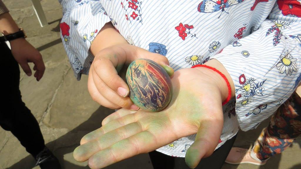 По традиция първото яйце беше натопено в червената боя, а след това малките участници развихриха въображението си и с много желание и старание обагриха над 350 яйца.