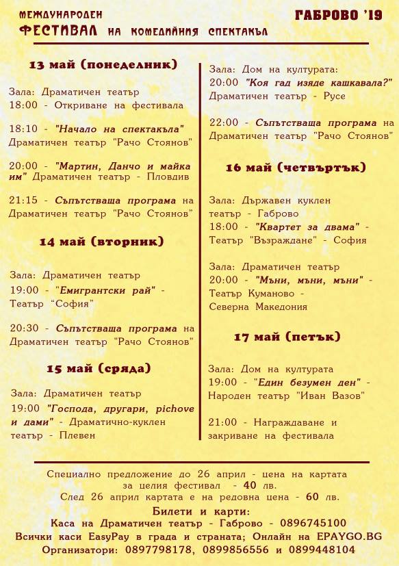 Билети и карти за фестивала може да закупите от касата на ДТ „Рачо Стоянов“ - Габрово – тел. 0896 745 100, всички каси ИзиПей/EasyPay и онлайн на epaygo.bg. Тел. на организаторите: 0897 798 178, 0899 856 556, 0899 448 104.