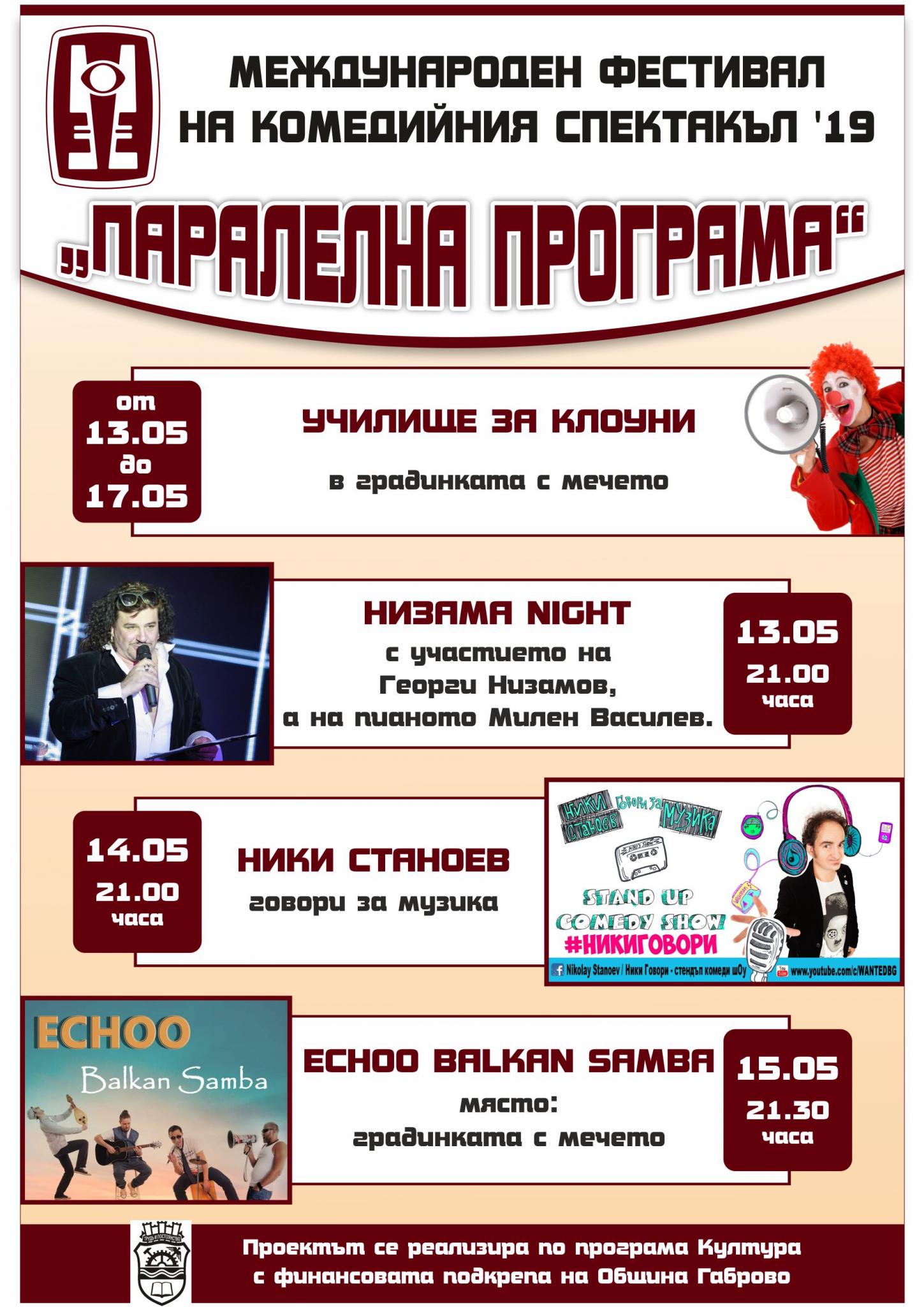 Докато сцените преливат от смеха на публиката, пространството около театъра ще очаква габровци и гостите на града да се включат в Паралелната програма. В рамките на три дни – от 13 до 15 май включително, съпътстващите събития ще огласят пространството с музика, смях, циркови и комедийни спектакли, много забавления. Ще видим Георги Низамов, Ники Станоев и бандата „Екоу Балкан Самба“ (Echoo Balkan Samba). Началният час е 21.00, само на 15 май събитието започва в 21.30 часа.