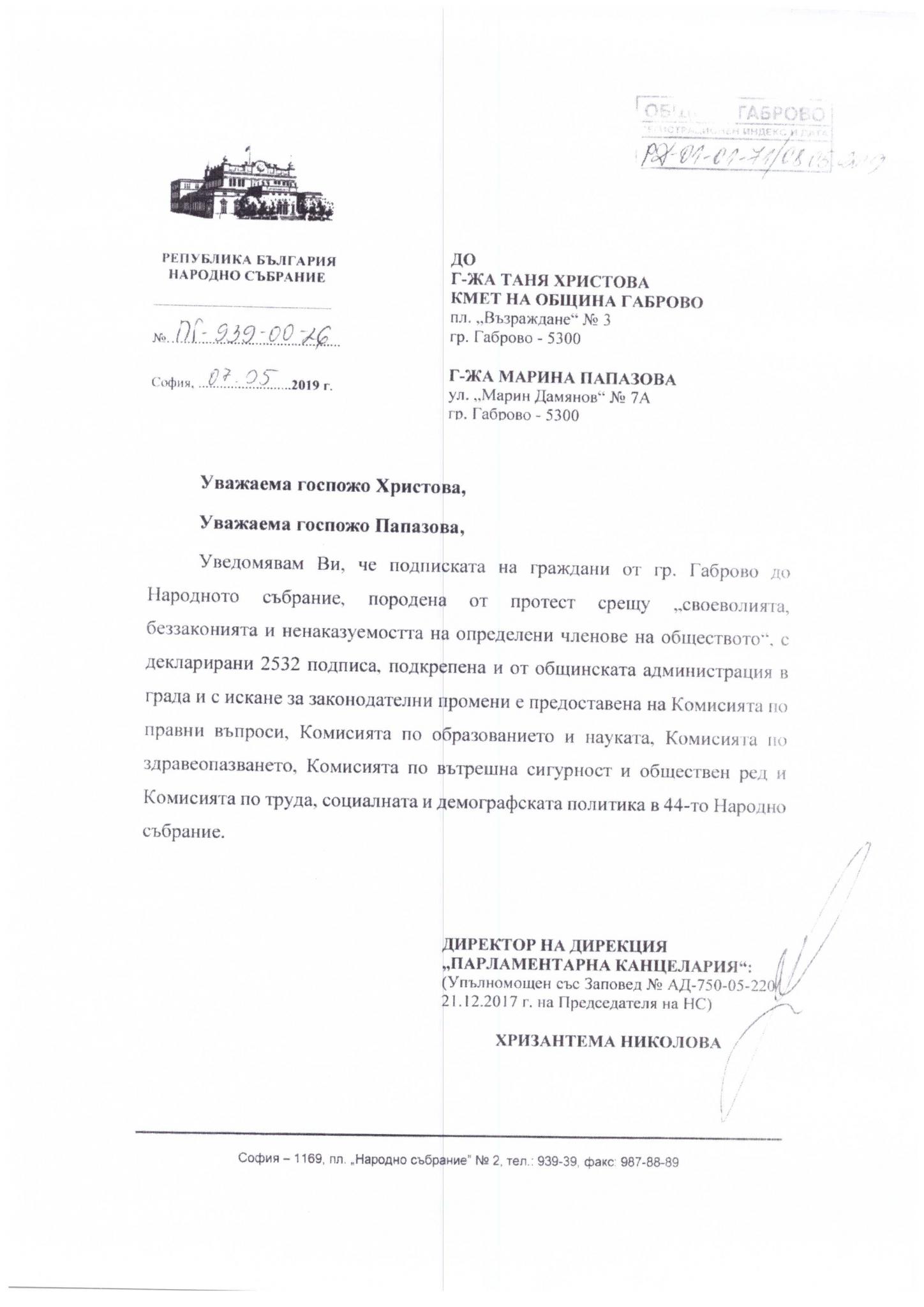 Дирекция „Парламентарна канцелария“ информира кмета на Габрово Таня Христова, че подписката на протестиращите граждани, с искания за законодателни промени, адресирана до Народното събрание, е предоставена на Комисията по правни въпроси, Комисията по образование и наука, Комисията по здравеопазване, както и на Комисиите по вътрешна сигурност и обществен ред, труда, социалната и демографската политика.