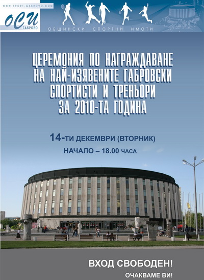 Зам.-министърът на физическото възпитание и спорта Иван Ценов ще пристигне днес в Габрово за официалната церемония по награждаването на най-изявените спортисти и треньори на община Габрово за 2010-та година. Тя ще се състои в спортна зала „Орловец”.