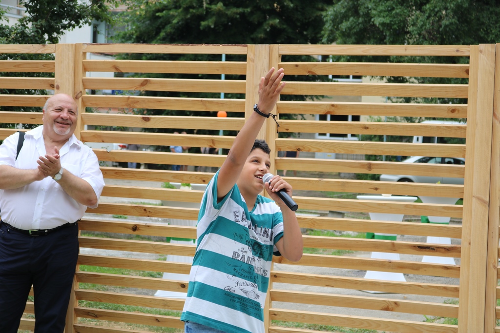 Шестокласникът Марин Иванов, възпитаник на музикална школа „Звезди в аванс“, поздравява присъстващите