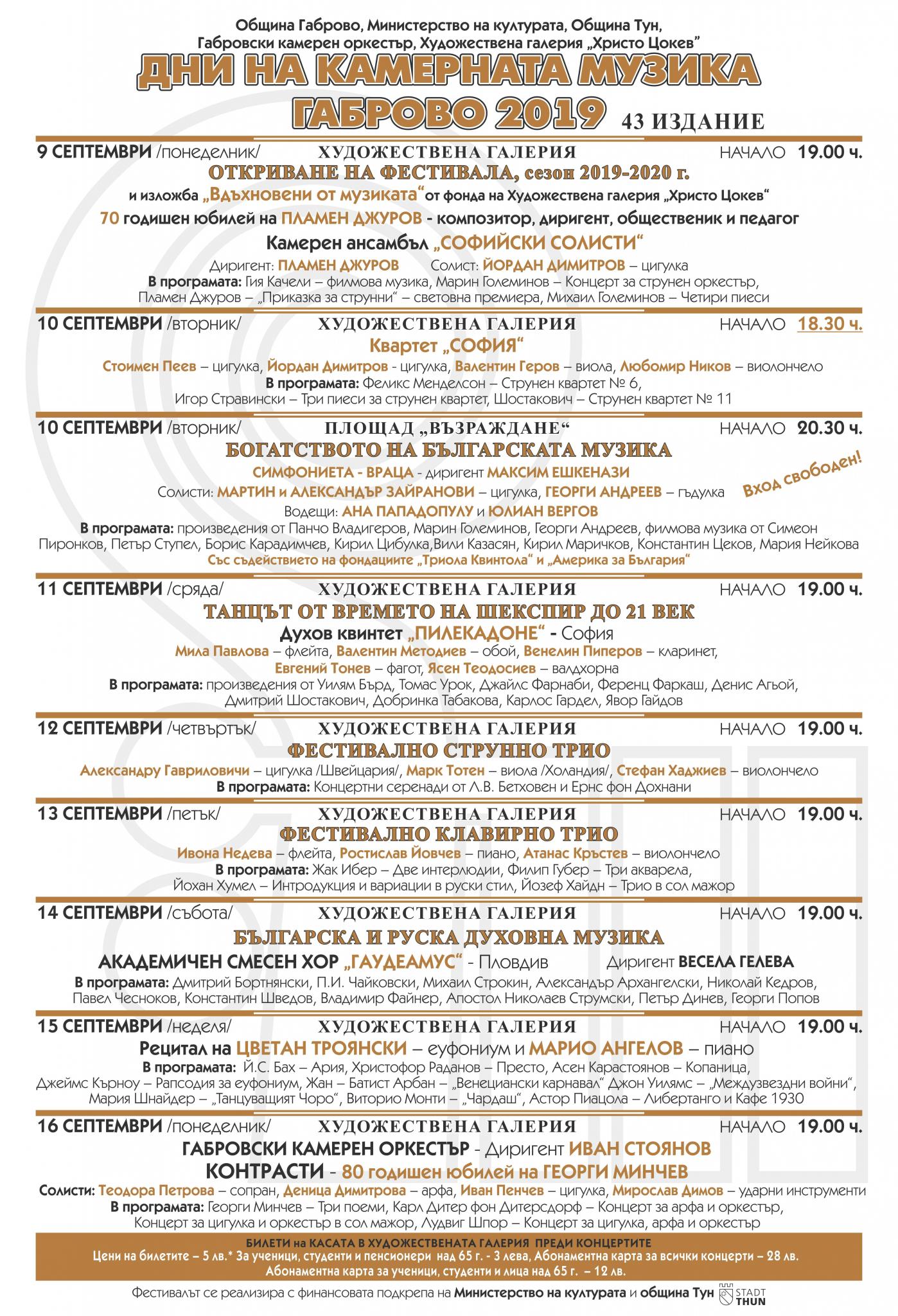 43-тото издание на Международния фестивал „ДНИ НА КАМЕРНАТА МУЗИКА ГАБРОВО 2019“ ще се открие на 9 септември. Фестивалът запазва стремежа да обновява афиша си с нетрадиционни концерти и да разчупва рутината и стереотипите при програмирането. Новост са концерт със солово участие на почти непознатия за широката публика меден духов инструмент еуфониум, първото гостуване в Габрово на струнен квартет „София“, Духов квинтет „Пилекадоне“, фестивално клавирно трио, симфониета „Враца“, диригентът Максим Ешкенази, световна премиера на произведение от Пламен Джуров.