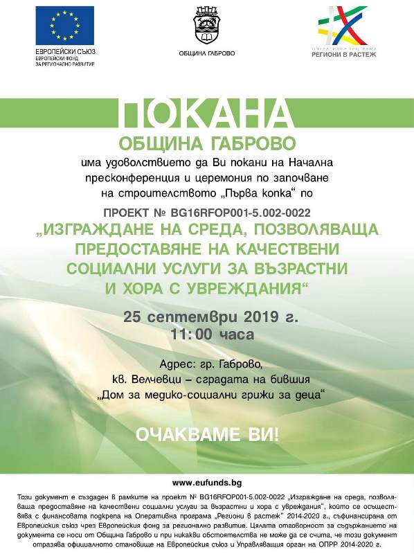 Като конкретен бенефициент по процедурата „Подкрепа за деинституционализация на социалните услуги за възрастни и хора с увреждания“ Община Габрово получи безвъзмездно 1 095 000 лв. по Оперативна програма „Региони в растеж“.