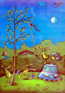 Изложбата е тематична и се нарича „В помощ на майката Природа”. Съставена е от 35 цветни карикатури на Валериу Курту (Германия), в които прозира чисто човешката загриженост на автора за оцеляването на Земята и нейната природа. Проблемът за опазването на околната среда от години занимава автора и го вдъхновява за нови творби на тази актуална тема. Всяка творба на карикатуриста звучи като апел към хората за повече грижа и обич към зеленото богатство на планетата, за защита на животните и растенията. Сериозната тема за опазване и защита на майката Природа не е представена с назидателен тон, а с голяма доза чувство за хумор и весело намигване към героите – обикновени хора, които се борят с вредители или събират плодовете от своя труд, понякога действат непохватно или наивно, но са явно доказателство, че връзката между човека и природата е вечна и всеки от тях зависи от другия.