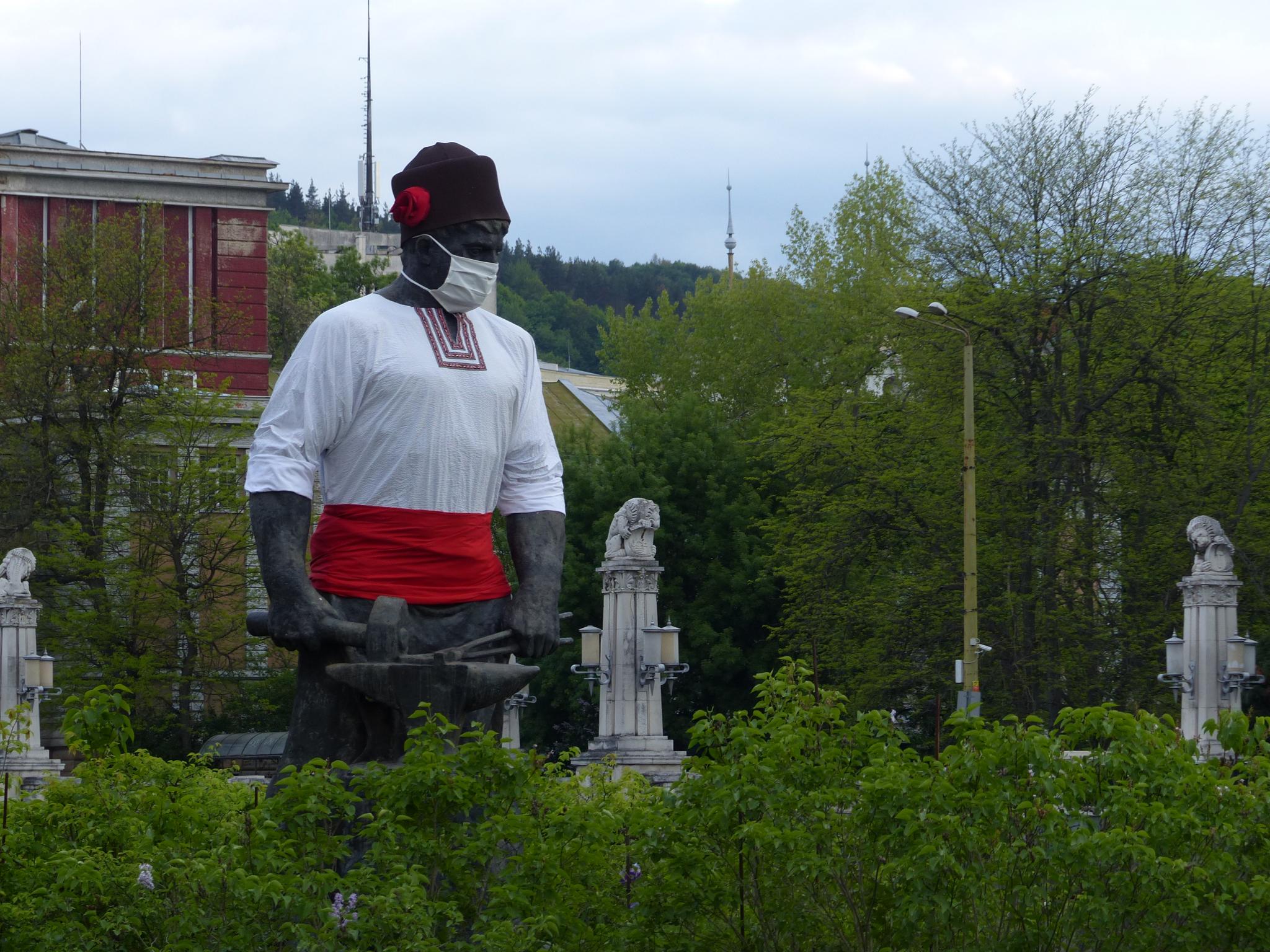 Митичният основател на Габрово Рачо Ковача, късно вчера се премени с традиционните си нови одежди. Художниците на карнавала му помогнаха да облече нова бяла везана риза, калпак с китка, червен пояс и… предпазна маска. Първите преминали покрай него шегаджии дори го определиха като най-строго спазващият мерките против Covid-19 – хем ситуиран според социалната дистанция - в реката, хем с маска, за да пази себе си и другите.