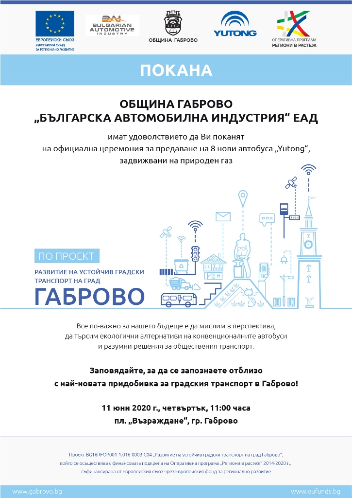 Церемония по предаването на 8 нови екологични автобуса „Юйтун“ (Yutong), задвижвани на природен газ, ще се състои в Габрово на 11 юни 2020 г.