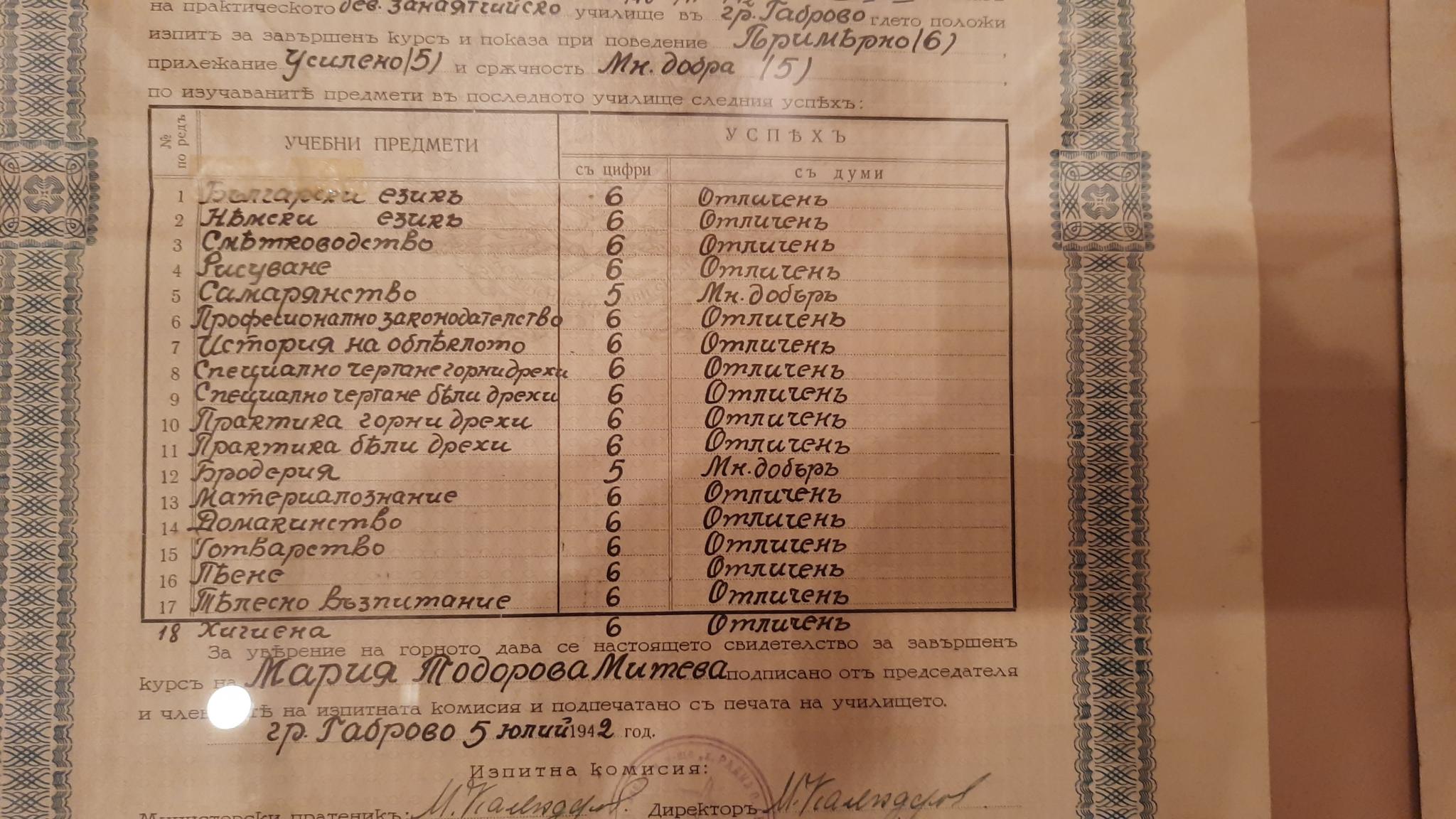 За високото ниво на подготовка в Стопанското училище, продължило като Девическо практическо занаятчийско училище „Хаджи Радка Пенчо Семова”, свидетелстват тетрадките на ученичките – по отделните предмети, за годишните изпити, наградите на училището и признанието, което получава. Всяка една тетрадка - по оформление, съдържание, структуриране на рисунките и моделите, прилича по скоро на моден журнал, отколкото на ученическо пособие. Акцент сред показаните музейни експонати е училищното знаме - осветено при откриването на новата сграда. Впечатляващ като идея, изработка и послание („Трудът е богатство“), двулицевият символ разкрива и част от драматичната и превратна съдба на „Майчина грижа“. На гърба на знамето, освен годината на освещаване на новата сграда – 1935-та, стои и 1944-та, което подсказва, че училищната светиня е преработвана след обществено-политически промени и национализацията.