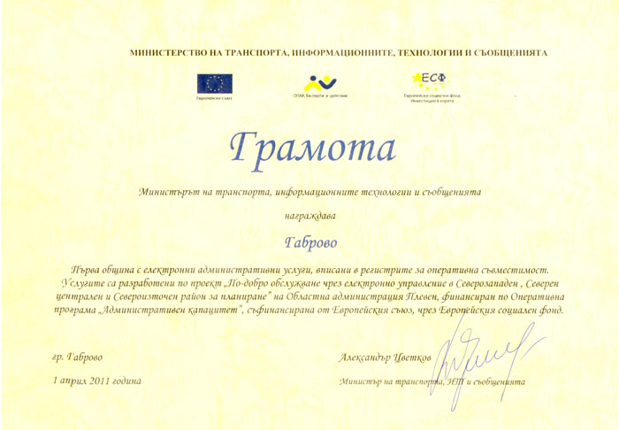 Министърът на транспорта, информационните технологии и съобщенията Александър Цветков връчи на кмета Николай Сираков грамота, с която награждава Община Габрово като първа Община с електронни административни услуги, вписани в регистрите за оперативна съвместимост. Услугите са разработени по проект „По-добро обслужване чрез електронно управление в Северозападен, Северен централен и Североизточен район за планиране” на Областна администрация Плевен, финансиран по Оперативна програма „Административен капацитет”, съфинансирана от Европейския съюз чрез Европейския социален фонд.