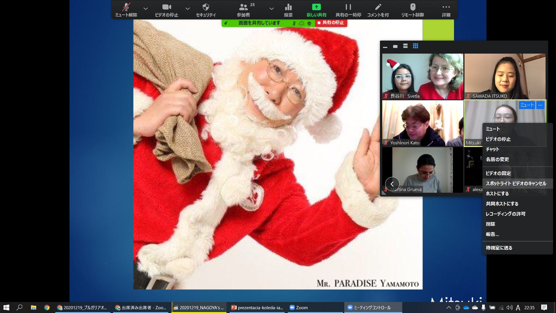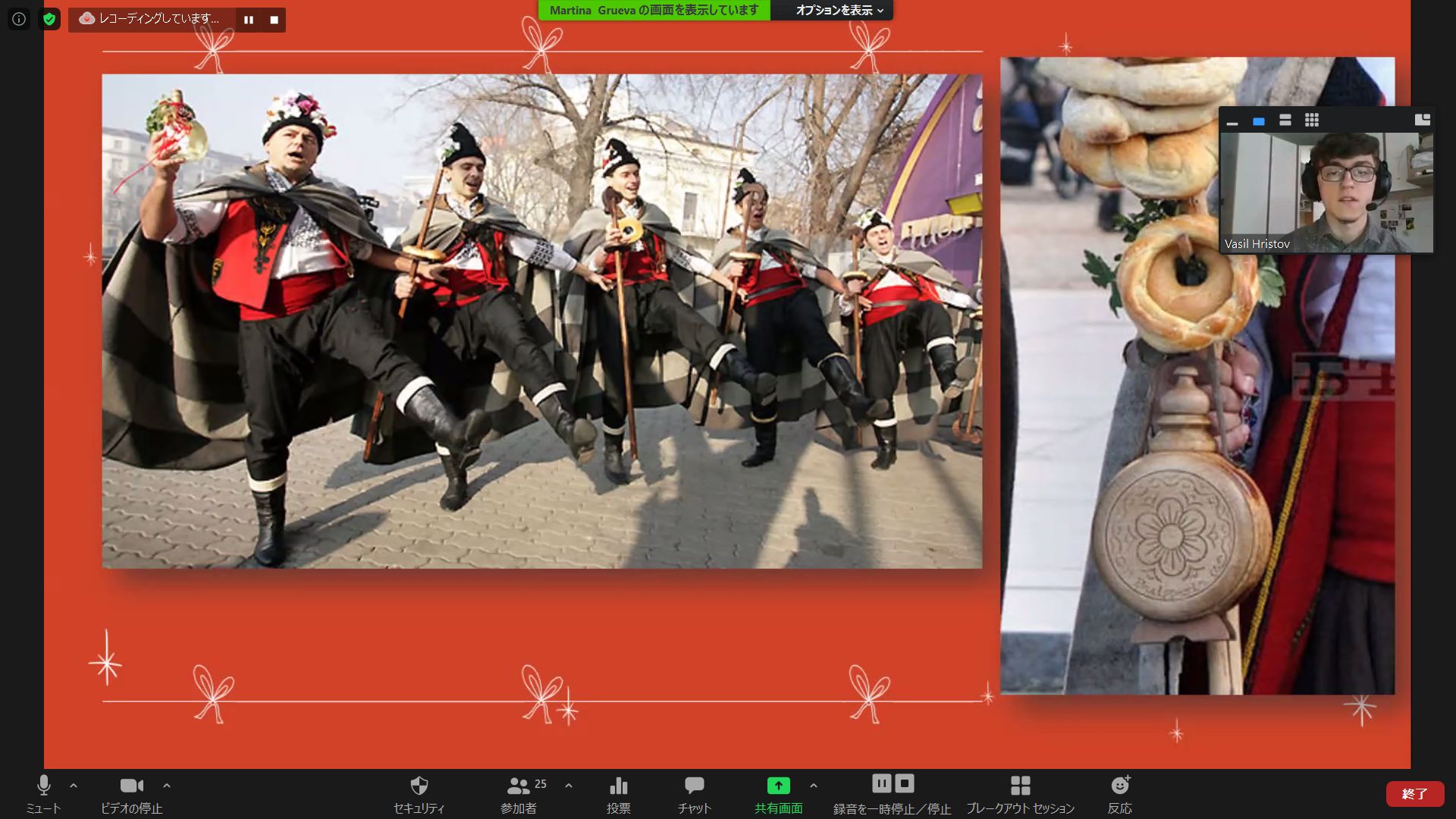 Японските ученици разказаха за Коледа в Япония. Макар празникът да няма християнската символика, семействата също се събират заедно и се веселят. Те бяха подготвили снимки от украсата в Япония и споделиха, че чакат с нетърпение фойерверките в новогодишната нощ. Бяха подготвили и кратко филмче със снимки от последното гостуване на българската група в Тойоаке.